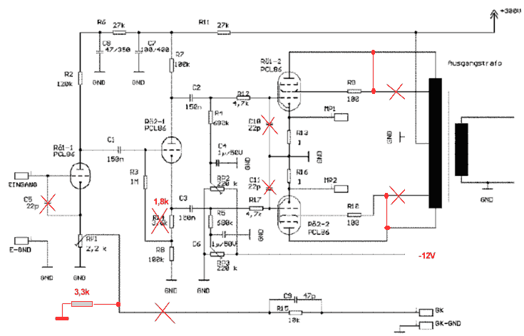 Außerdem fällt der viel zu geringe Anodenstrom der Phasenumkehrstufe auf. Sie übersteuert beim Aufdrehen schon kurz "hinter" dem Clippingeinsatzs der Endstufe. Das Problem wird durch Parallelschaltung eines 3,3 k Widerstands zum 3,9 k Kathodenwiderstand gelöst.