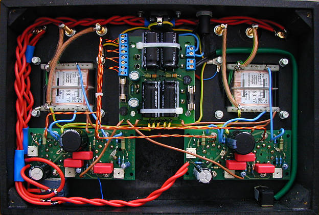 Der Einbau läuft problemlos, die knappe Beschreibung genügt mir vollkommen. Pfiffig ist die von Reinhöfer vorgeschlagene Idee, die Trafoschrauben mit ihren Muttern von unten gegen die Hutmuttern oben zu schrauben. So lässt sich die Länge der Gewindestange optimal einstellen. Das Gehäuse ist recht klein, deshalb wird's beim Schalter recht eng und mein Alps-Poti passt erst, nachdem ich das Kunststoffgehäuse bis auf hauchdünne Reste abfeile.
